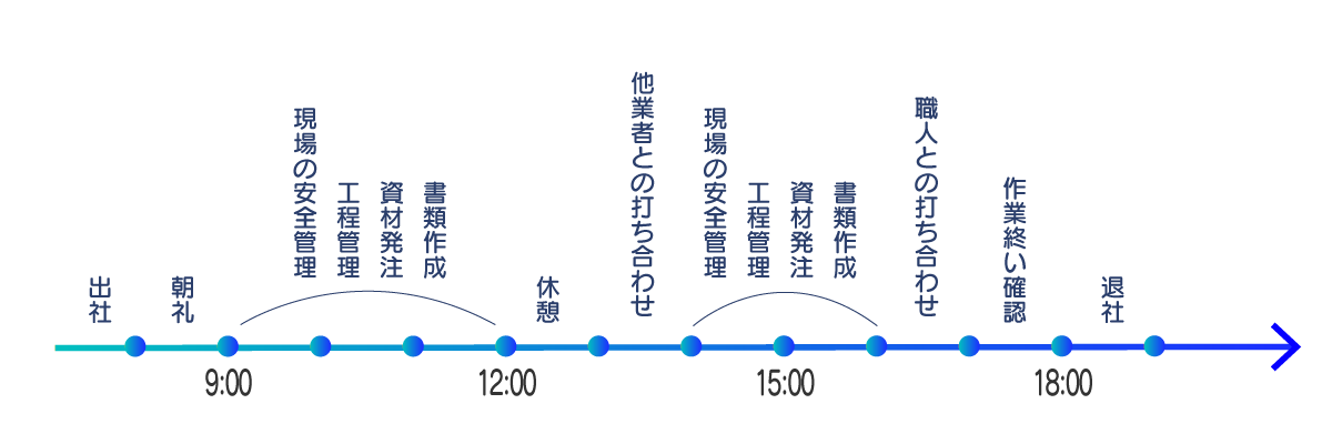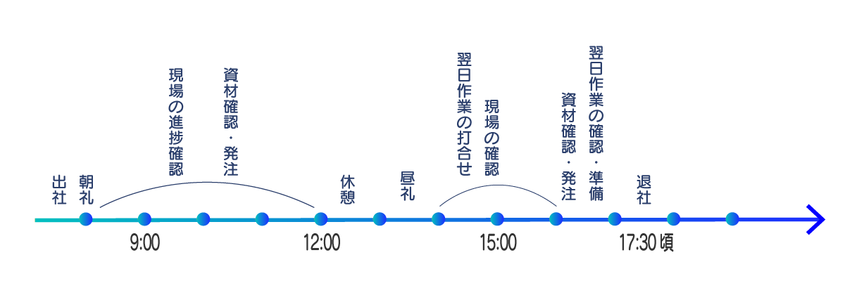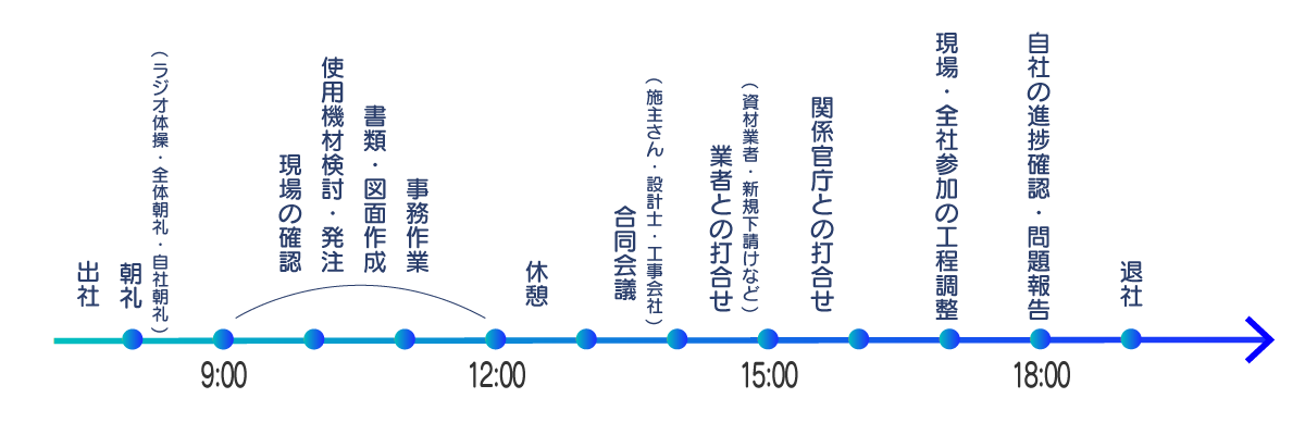 (工事部は担当する現場に直接出勤し、現場内の事務所で業務を行うことが多いです)